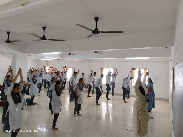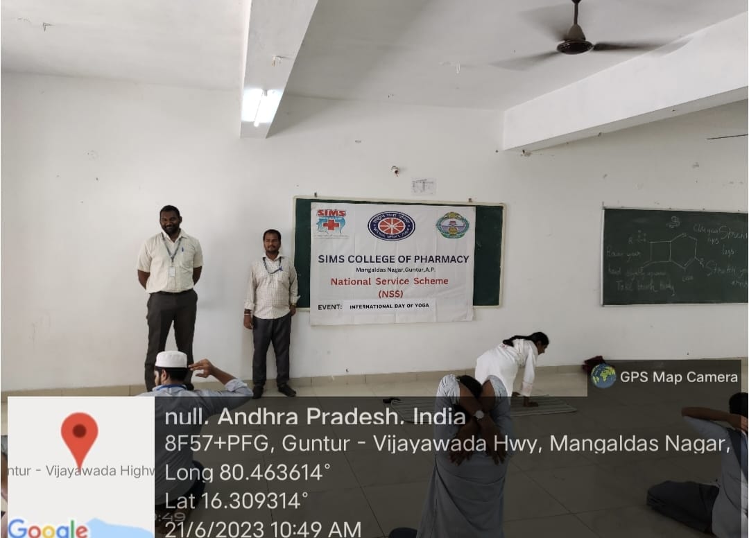 The International Yoga day-was organized by NSS-unit of Sims College of Pharmacy in the college premises on 21/06/23. It was inaugurated by the principal dr.B.Thangabalan and Dr.K.Vinod kumar. Dr.B.Thangabalan has addressed the felicitation speech about international yoga day. Dr.Venu gopal garu trained student participants about yoga positions and meditation. Few students presented their information about “international yoga day”. The staff, students were voluntarily participated in this event and made it success.
